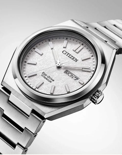 Pairing classic proportions and innovative technology with a distinctly modern style, we present our new Zenshin collection. Made with our proprietary material, Super Titanium™, which is five times harder and 40% lighter than stainless steel and is scratch- and rust-resistant, this sporty timepiece features a 39mm silver-tone Super Titanium™ case that is elevated with finely brushed and polished finishing while being secured to the wrist with an integrated matching bracelet. On the dial, a textured white colour is accented with an outer minute ring in black, with silver-tone details and luminous hands and markers. A combined day-date window at the 3 o’clock position adds daily utility and hints at the watch’s retro-style inspirations. Sustainably powered by any light with Eco-Drive technology and never needing a battery, this versatile watch is also water resistant to 100 metres. Calibre J800.