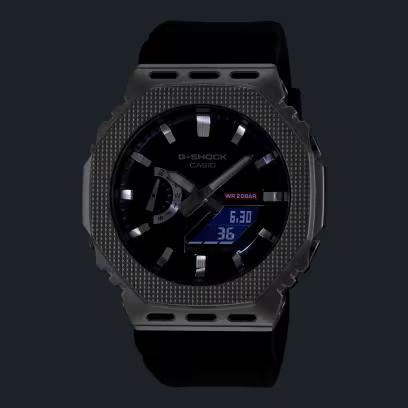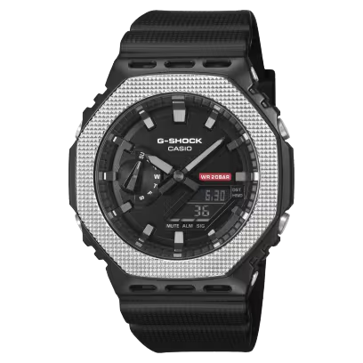 Streamlined design, striking functional beauty, shock-resistant construction — a toughness-driven G-SHOCK with a monochromatic modern industrial look. The digital GM-5600, with iconic shape and metal bezel, and the analog-digital combination GM-2100 take on an achromatic color scheme that highlights the chic beauty of simplicity and functionality. The textured pattern of the metal bezel and the touch of red for the function label, symbolizing G-SHOCK dedication to total toughness, showcase pure functionality in design. The bezel’s unique form features openings that allow the center case inside to show through, flaunting the core technology of G-SHOCK: its shock-resistant structure. Delivering both streamlined, universal design and practical utility, this is a timepiece to enjoy for years to come.