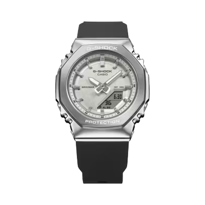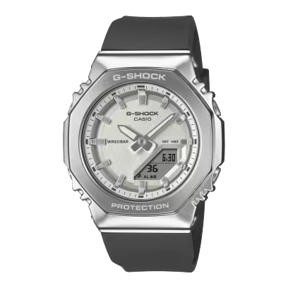 Strong, sophisticated, stylish — the octagonal GM-S2110 with metal bezel, in simple, super versatile color schemes. The dial in classic silver or black with crosshatch hairline finish brings the look of a sophisticated accessory to your wrist in a simple, yet expressive design. The compact design fits smaller wrists with total comfort. These versatile timepieces take you wherever you want to go — from everyday fun to high fashion, the striking dial adding a stylish accent to any outfit. Key resin components used in the band are made with bio-based resin. Produced using renewable organic resources, this material is expected to help reduce environmental impact.
