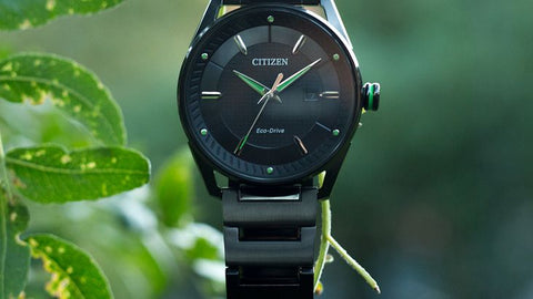 Check this out! The fresh design of this CTO timepiece from CITIZEN®'s DRIVE collection gives a modern look to a simple and classic style - perfect for the millennials of today. Shown in a black ion plated stainless case and bracelet with a matching black dial, this timepiece highlighted by green accents features a screw-back case and date display. Water resistant up to 100 metres.