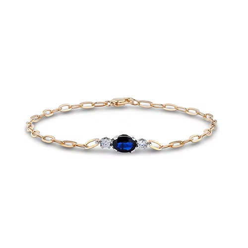 Gold paperclip chain bracelet featuring a genuine, natural 0.87 carat oval-cut sapphire, accented by two Canadian side diamonds with a total weight of 0.14 carat. Set in 10K gold. Accompanied with it's unique Canadian diamond certificate.