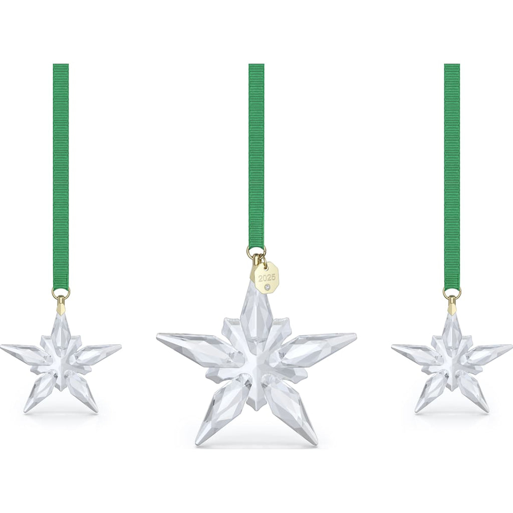 This magical holiday set continues the iconic tradition of Swarovski's Annual Edition Ornaments. The set features three clear stars, crafted with a total of 570 facets, that are inspired by the serenity of the night sky. Each star is suspended from a green grosgrain ribbon with champagne gold-tone plated accents, while the large star also includes a 2025 engraving on the tag. Designed especially for the festive season, this commemorative set would make a truly elegant gift or take pride of place in your own festive décor. Decoration object. Not a toy. Not suitable for children under 15.