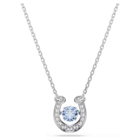 Maximise your glow with this meaningful horseshoe pendant. Featuring a rhodium plated motif, the centre of the design reveals a faceted blue dancing stone that creates a wondrous play of light. Wear this pendant yourself or gift it to someone special as a symbol of success.