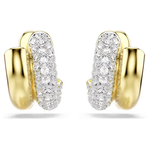 Embodying the industrial style of Dextera, these tubular earrings combine a gleaming 18k gold finish surface with a pavé of clear crystals on one side. An additional spring plate mechanism ensures each piece is easy to take on and off. Wear these mini hoops as a distinctive choice for your day to night styling.