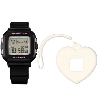 Mix and match to your heart’s content! Introducing an exciting convertible watch with a heart-shaped holder from the BABY-G + PLUS line of super fun watches. This convertible watch set comes in bold, charming colors all set for Valentine’s Day romance. Wear it as a wristwatch or place the center case into the heart-shaped holder, turning the watch into a unique time-telling charm. Add stickers and other decorations to customize the silicone watch holder and create your own one-of-a-kind look. Press the button to activate the light, and a cute heart shape appears on the LCD for even more playful fun. Not just amusing, but practical, as well. This BABY-G+PLUS watch also delivers shock-resistant construction and 100-meter water resistance. Go big this Valentine season with a sweetheart of a watch that will capture your affection! * Customers bear responsibility for decorations applied to the holder. Notes on silicone holder with strap: Avoid storing in direct sunlight, high temperatures, or high humidity. Attaching a metal strap may damage strap holes.