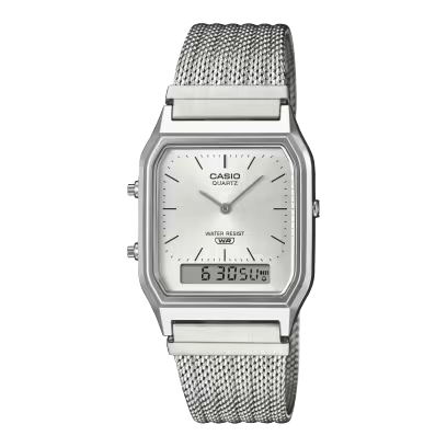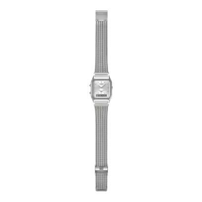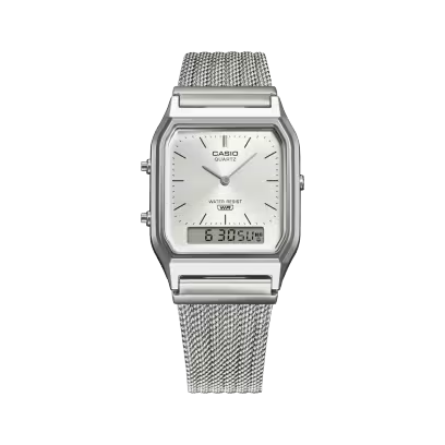 An updated take on a favorite classic — the analog-digital combination AQ-230 with angular face goes stylishly elegant with a fine-woven mesh band. Treated with a specialized pressing process that adds depth and dimension, the mesh band delivers a refined, vintage look and a totally comfortable fit for your wrist. Choose a dial in navy or a silver color to complement the silver-colored case. Updated with the mesh band, these classic designs make an even more striking style statement by highlighting the beauty of metal mesh, delivering a refined, elegant presence all their own.