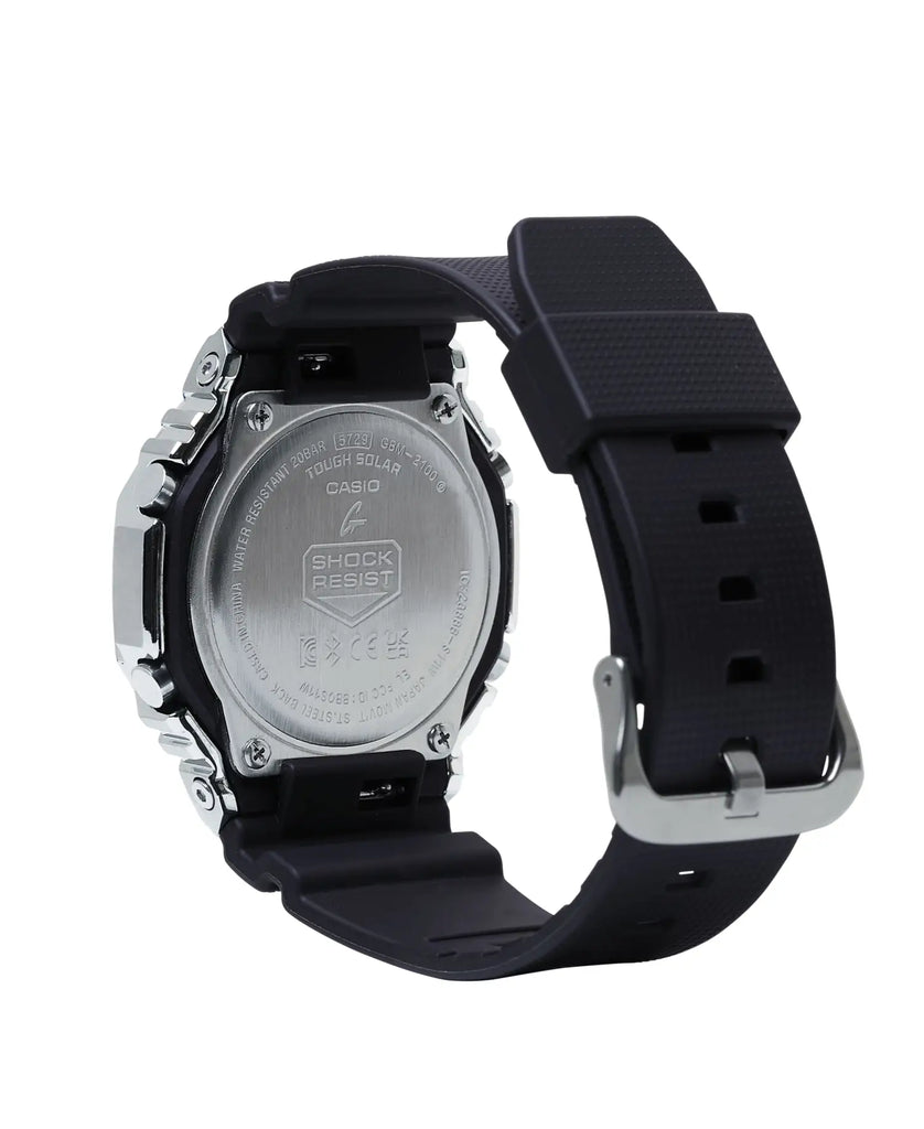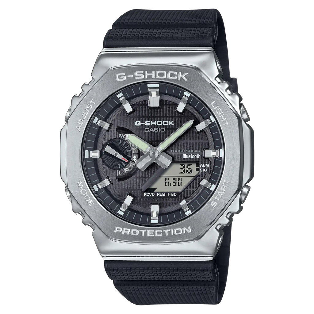 Metal-clad daring meets sophisticated gleam in a GBM2100 that delivers Smartphone Link via Bluetooth® and Tough Solar charging system, all in a meticulously finished metal design with iconic octagonal bezel. Choose from a basic black dial or metallic vapor deposition in blue or green, each complemented by a band made of environmentally responsible bio-based resin. Welcome to a whole new level of metal-clad 2100 functionality — tough construction and stylish design in a timepiece that takes you from casual settings to business meetings without a thought.