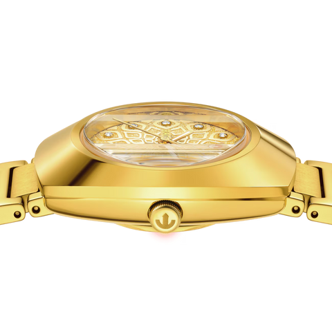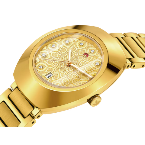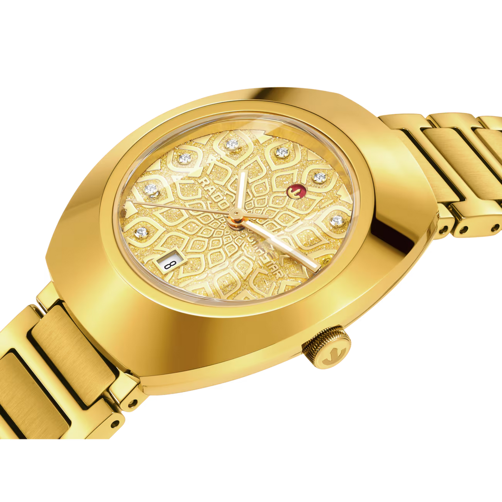 An iconic symbol of Swiss craftsmanship and pioneering innovation. The Rado DiaStar is designed for those who dare to embrace the extraordinary. The 30 mm case, crowned by a polished yellow gold-coloured PVD coated Ceramos™ bezel, merges effortlessly with a polished yellow gold-coloured PVD coated stainless-steel middle case, offering water resistance up to 10 bar (100 metres). The dial features a yellow-coloured harmonic pattern laying against a diamond-powder-like background combined with 11 cubic zirconia set in yellow coloured mount, playing elegantly with light, highlighting the iconic gold-coloured moving anchor and a meticulously positioned date window at 6 o’clock. Yellow gold-coloured hands with white Super-LumiNova® ensure perfect readability at all times. This refined display is safeguarded by vertical faceted sapphire crystal with an anti-reflective coating inside. At its heart lies the automatic R586 calibre. Finely regulated in five positions and featuring a Nivachron™ hairspring, this movement delivers a high level of accuracy and 48-hour power reserve. The overall appearance of this iconic timepiece is completed with a yellow gold coloured PVD coated stainless-steel bracelet, blending polished links and brushed middle links, secured by a polished, yellow gold coloured, PVD coated, stainless steel 3-fold clasp.