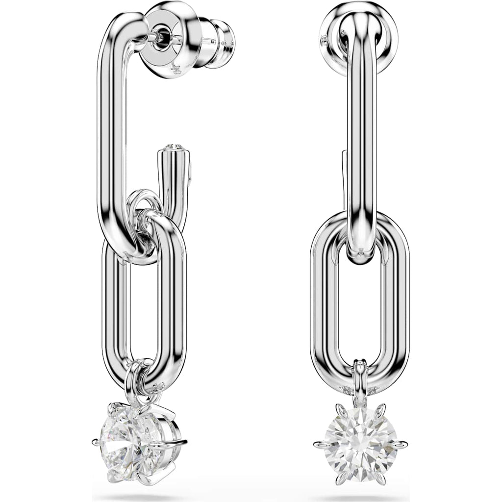 These playful earrings are a perfect choice for unexpected styling. Each piece features two interconnecting links in rhodium plating with a prong-set Swarovski Zirconia that delicately hangs beneath. It’s a sleek, metallic look for any occasion, with an extra burst of Swarovski light.