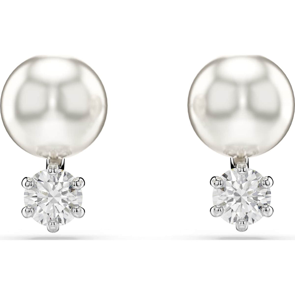 These stunning pierced studs are a fresh take on the classic pearl earring. Each rhodium plated piece features a single white Swarovski Crystal Pearl and a round-cut Swarovski Zirconia, linked in a refined display of light-filled luxury. Pair with a matching Matrix pendant for added radiance.